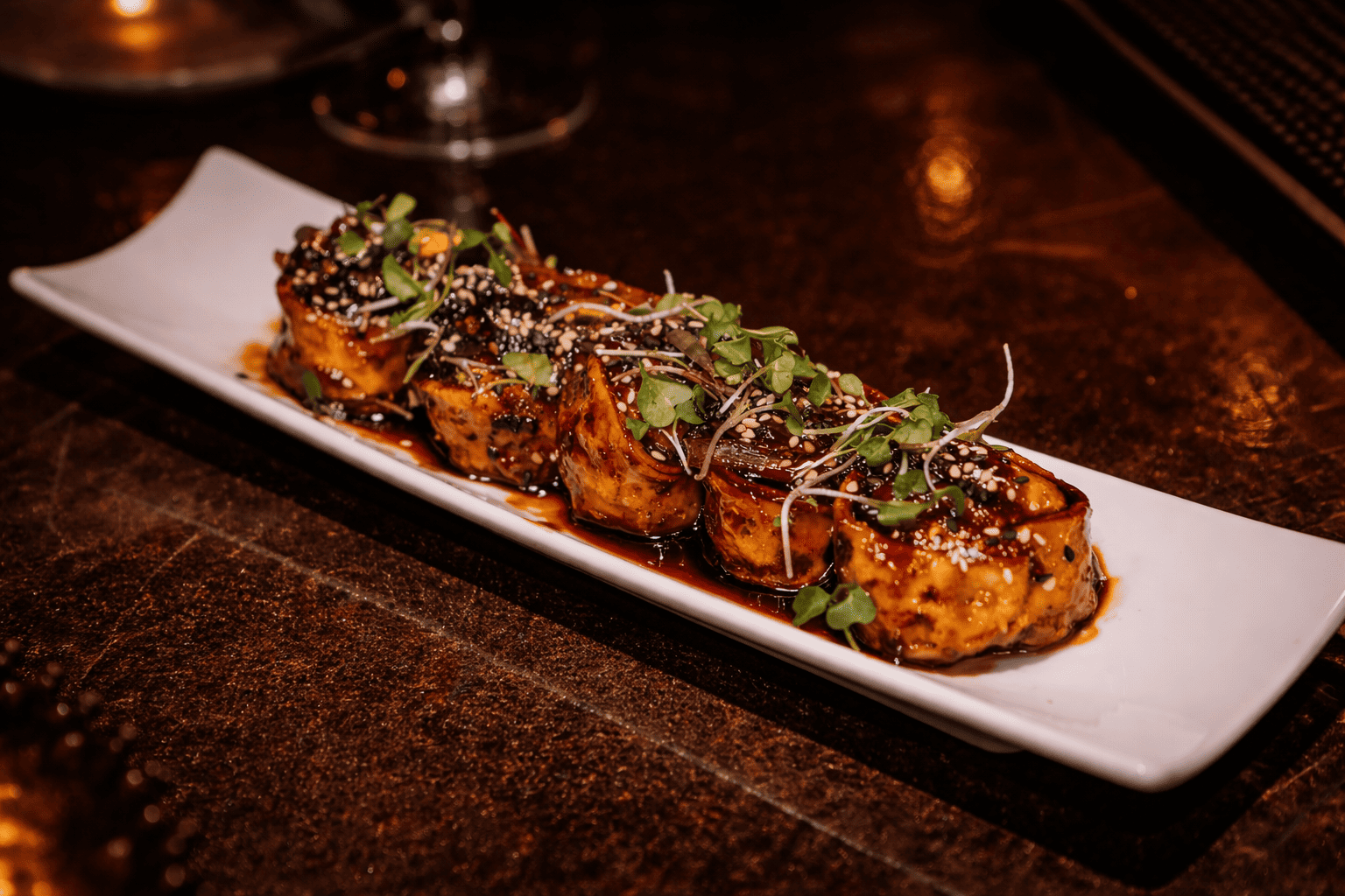 Stewed chicken / Sweet plantain / Pepper mix Sesame seeds / Asian sauce